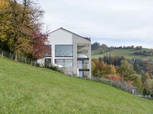 Der Neubau orientiert sich in seinen Abmessungen, der Höhe und Richtung an den umliegenden Bauten. Die moderne Optik bildet einen leichten Kontrast im Quartier, wirkt aber durch seine passenden Abmessungen stimmig und nicht aufdringlich.