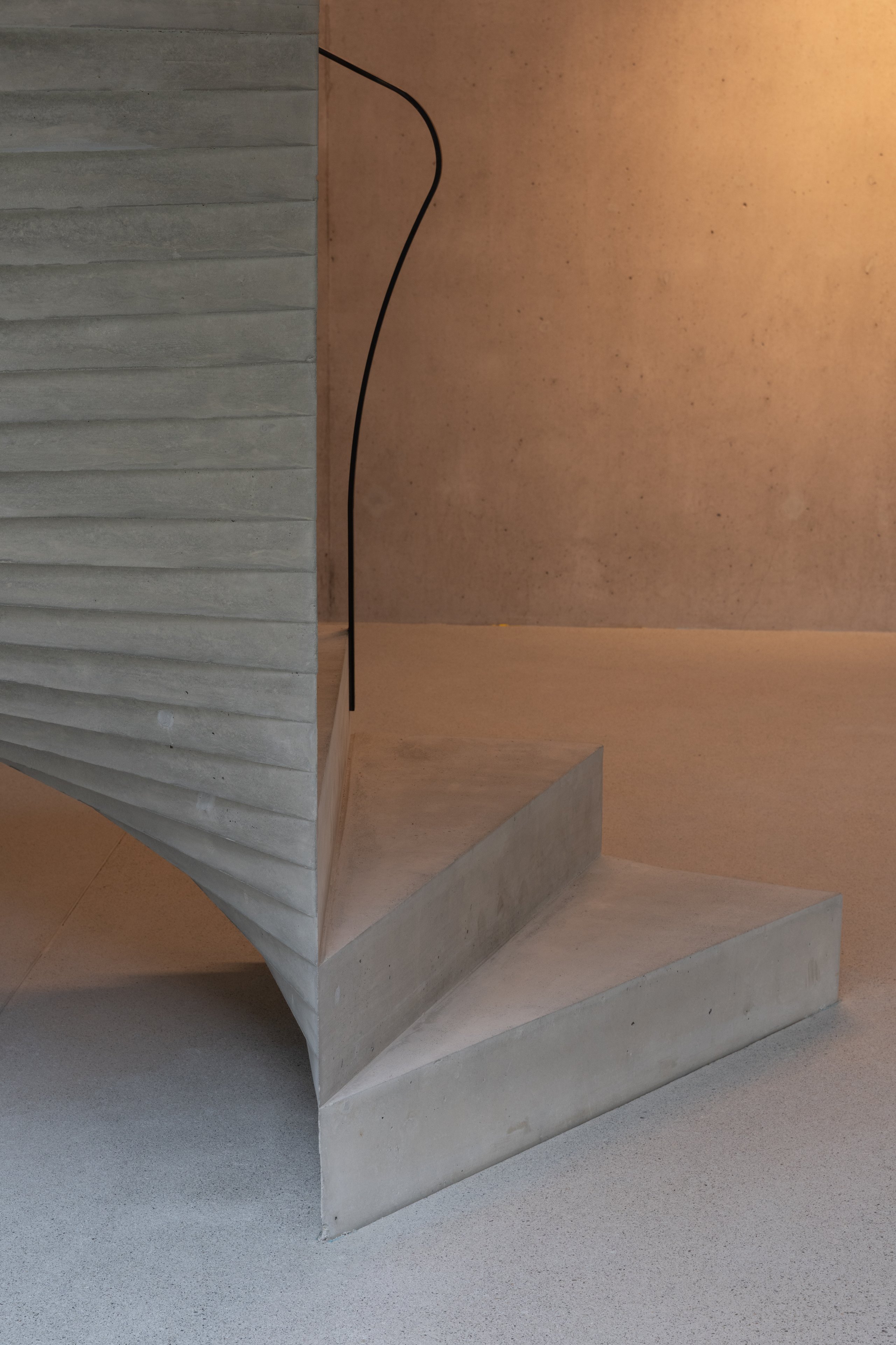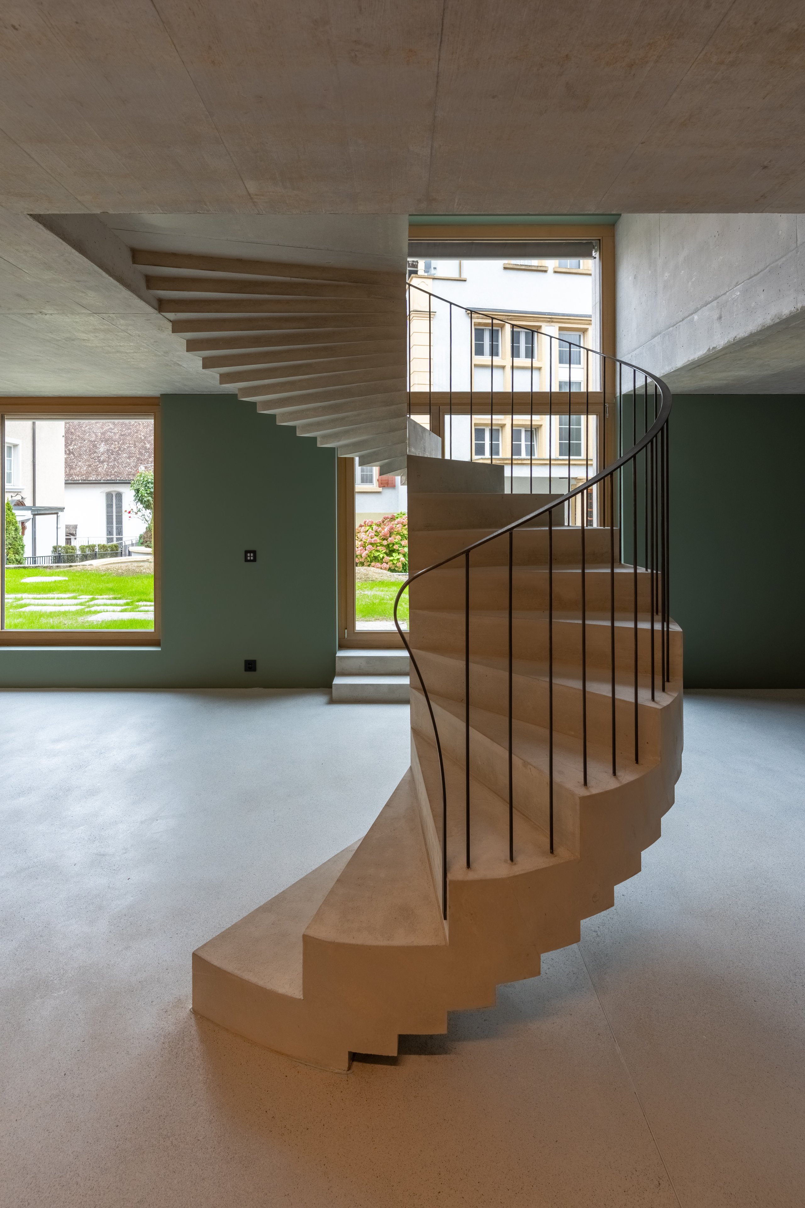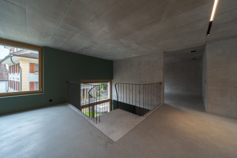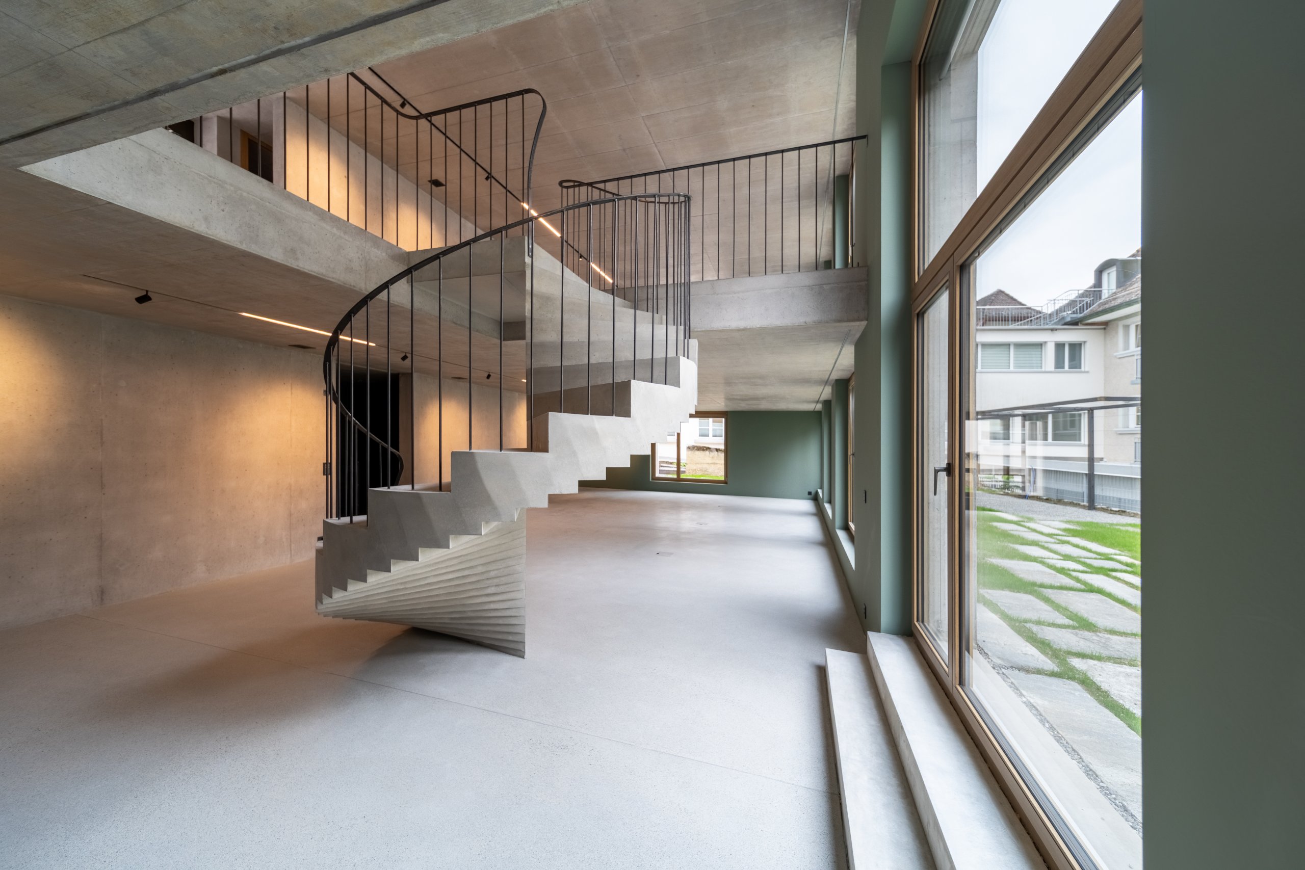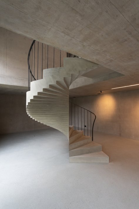 Innen dominiert Sichtbeton das Gesamtbild. Die Treppen werden skulptural gestaltet und bilden zentrale Gestaltungselemente. Die harmonische Raumstimmung entsteht im Zusammenspiel von Licht, Material und Farbe.