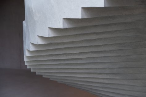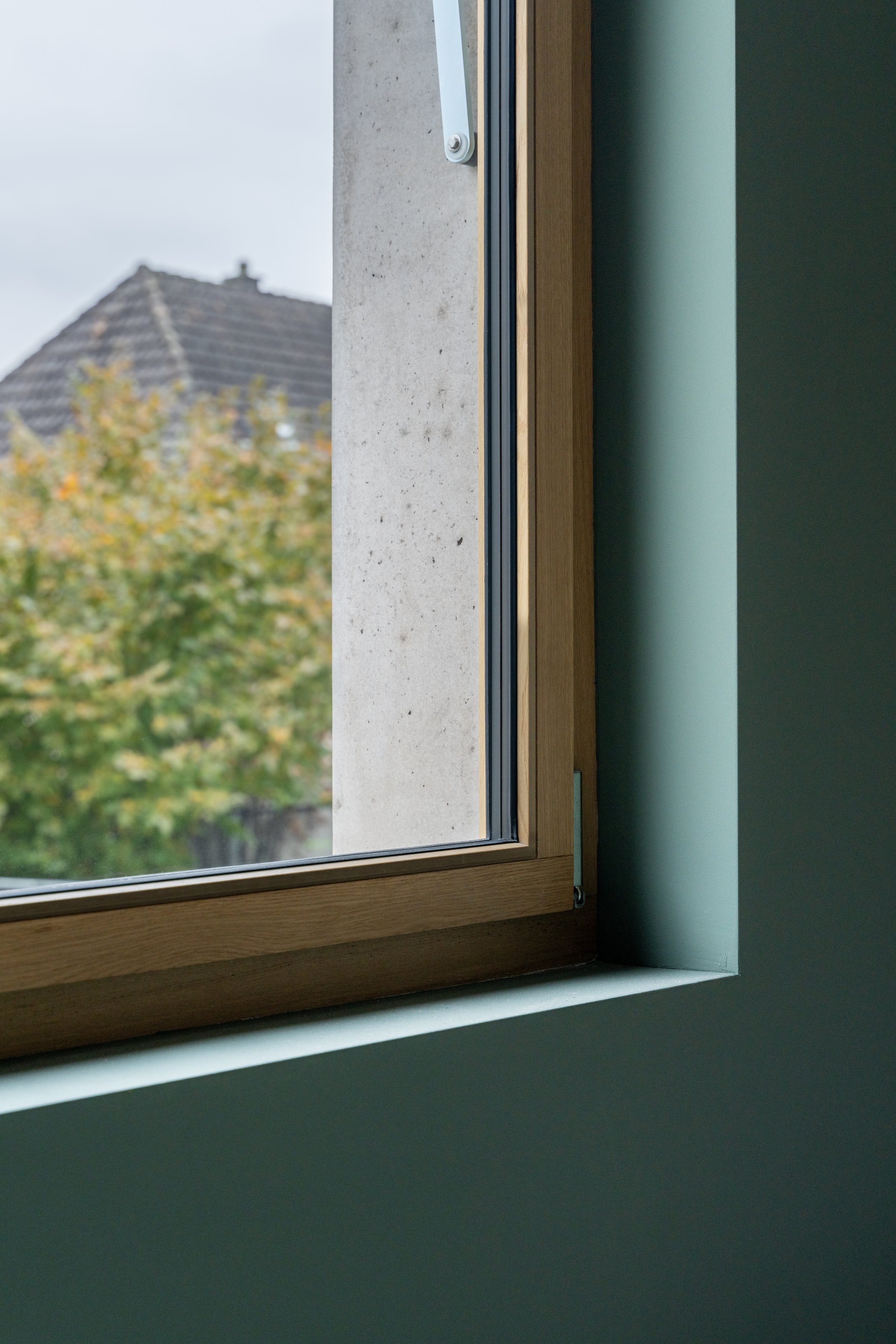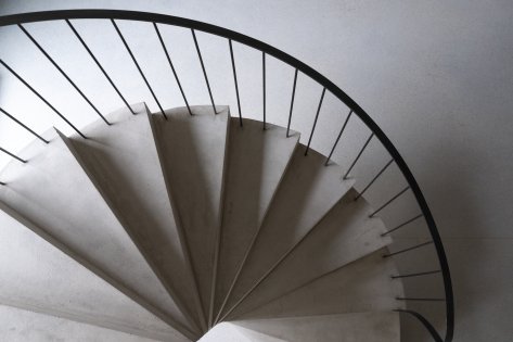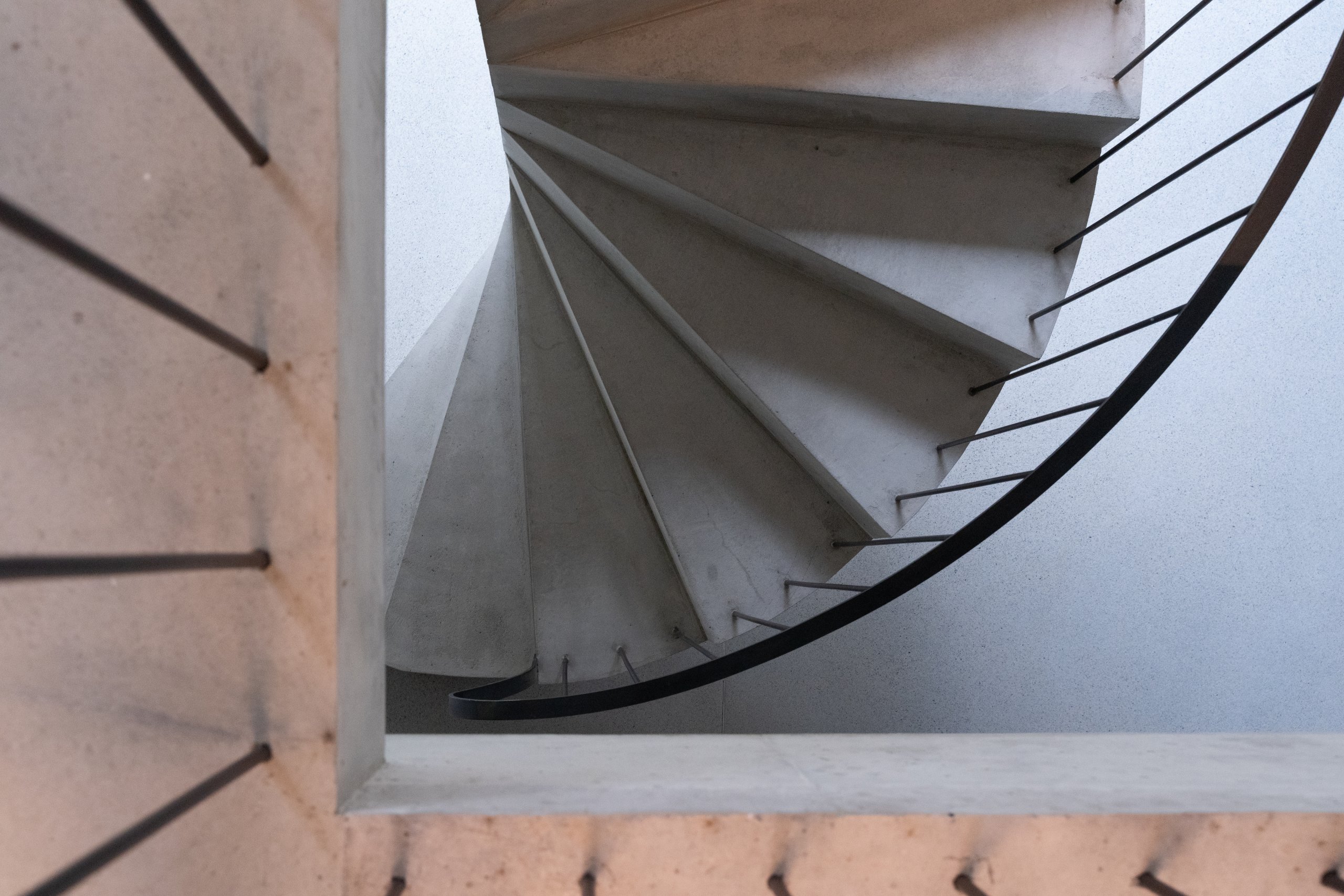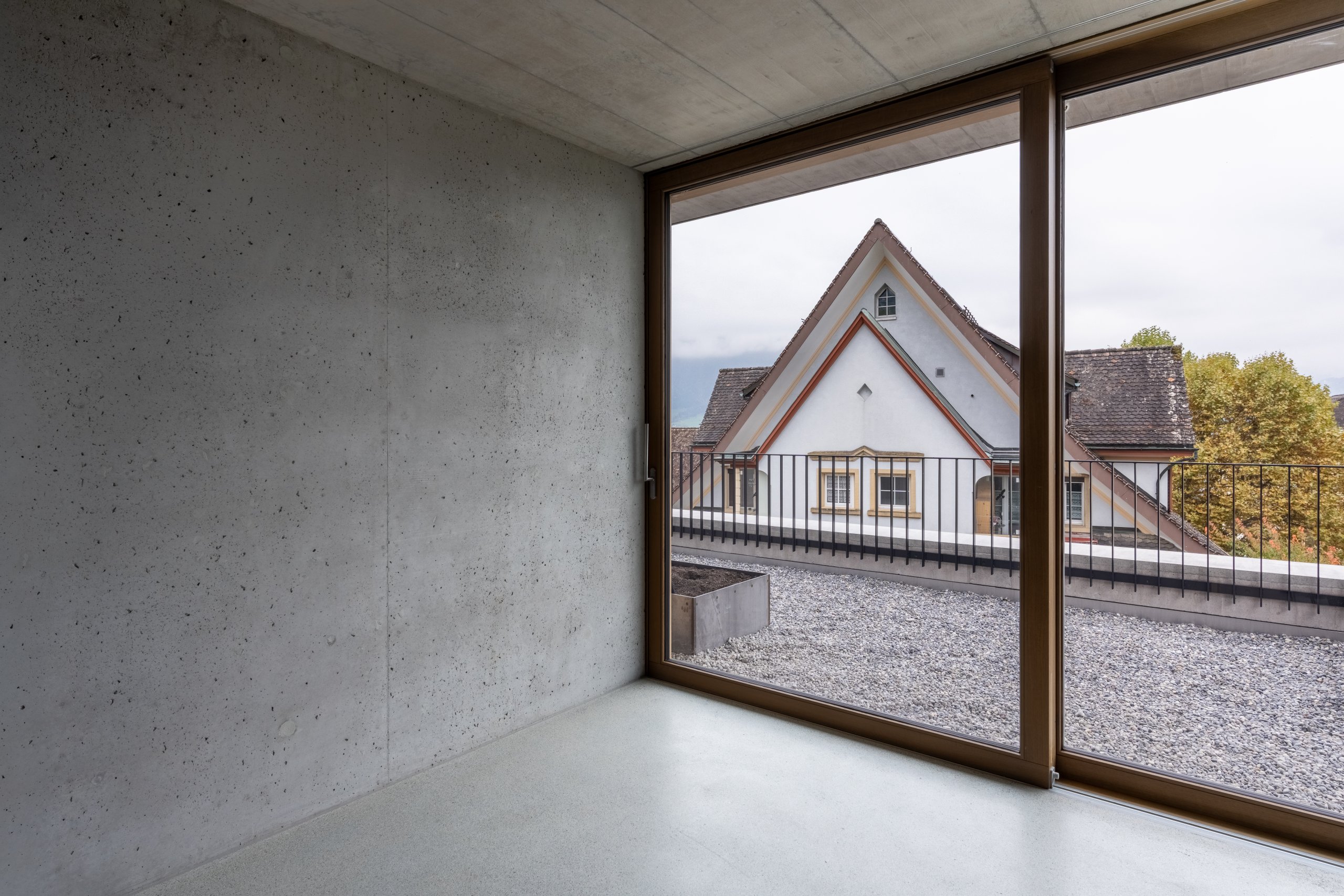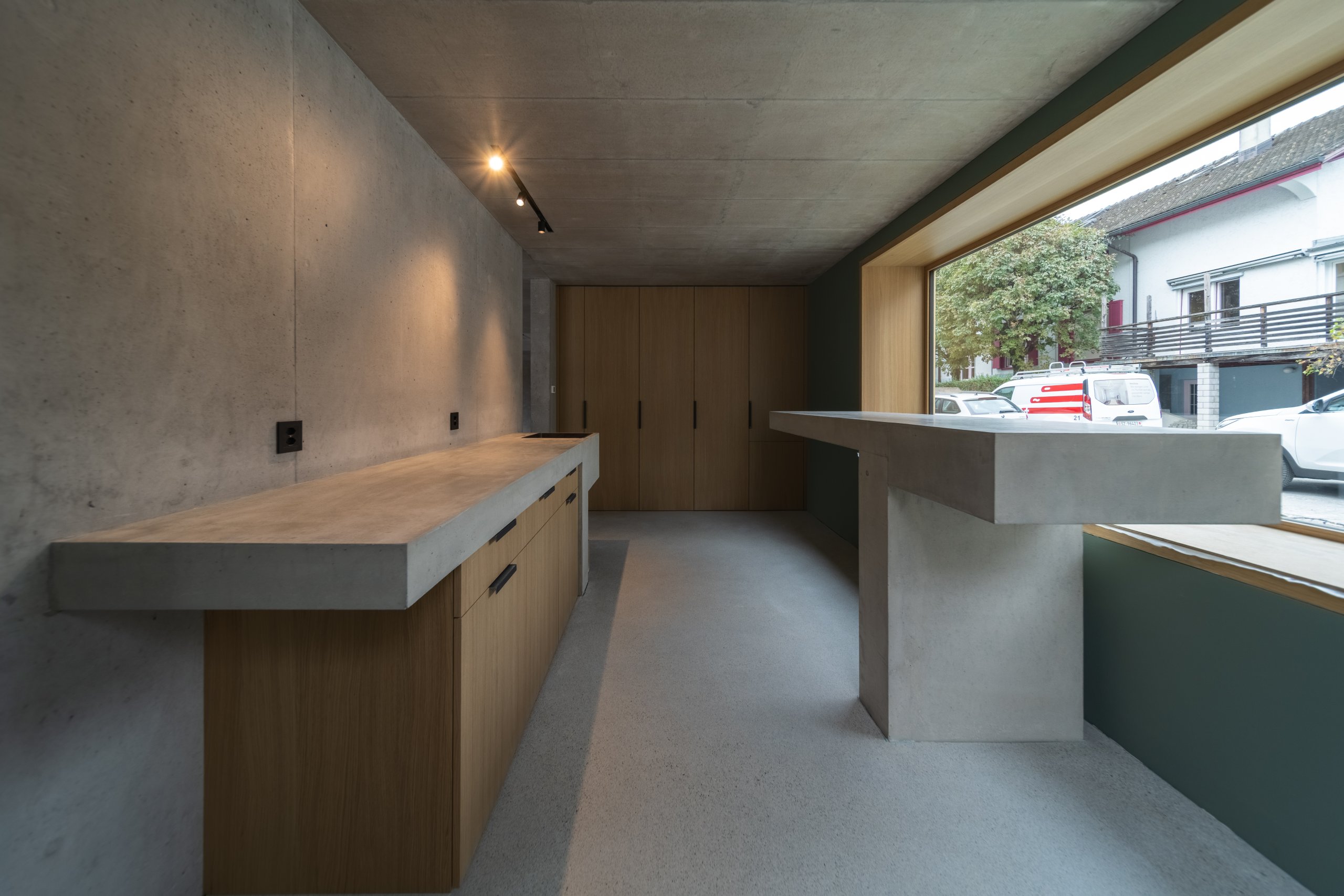 Innen dominiert Sichtbeton das Gesamtbild. Die Treppen werden skulptural gestaltet und bilden zentrale Gestaltungselemente. Die harmonische Raumstimmung entsteht im Zusammenspiel von Licht, Material und Farbe.